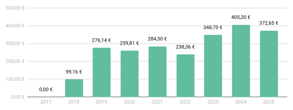 In der kumulierten Jahresansicht liegt dieses Jahr nach diesem Monat 324 € und damit noch knapp 8,5 % über dem Vorjahresniveau.