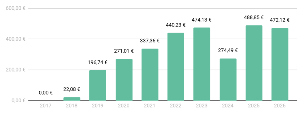 Insgesamt gingen im September 472,12 € Dividenden ein. Damit habe ich nicht ganz das Niveau von 2025 erreicht.